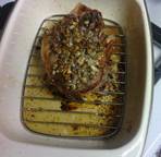 Remove from the refrigerator 1 hour before cooking. Rub with sea salt and fresh ground pepper to taste. Place on a rack in a shallow pan and cover with chopped fresh garlic (I used an entire head of garlic), dried rosemary, and thyme. Preheat the oven to 450°F.